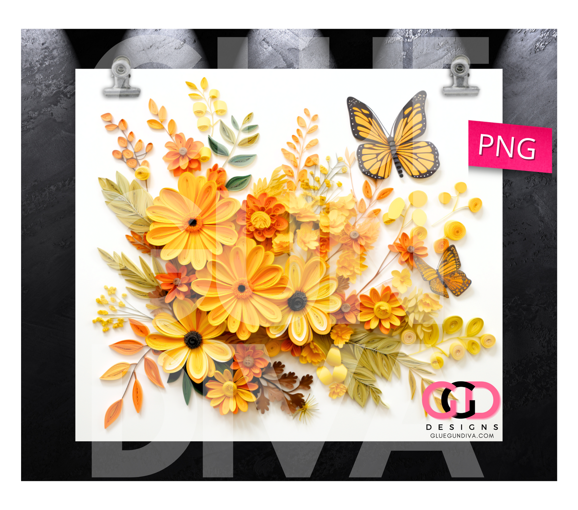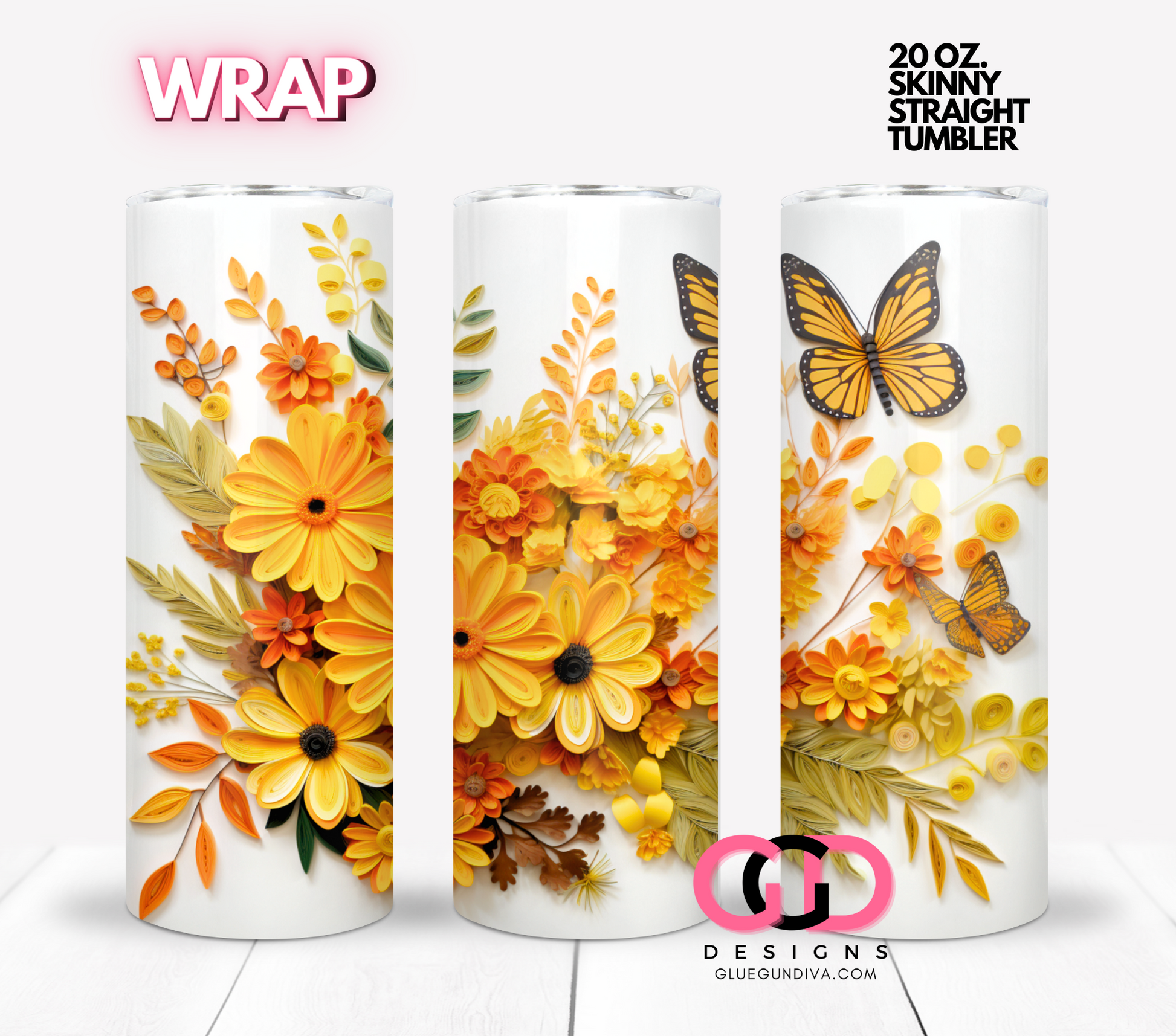 3D Orange flowers and butterflies - Digital tumbler wrap for 20 oz skinny straight tumbler