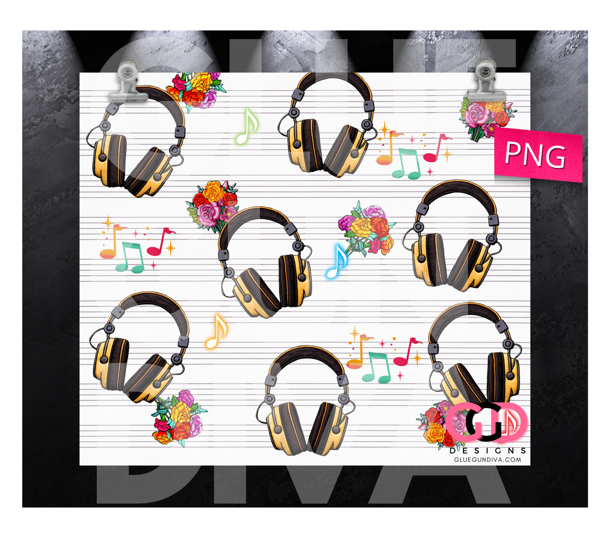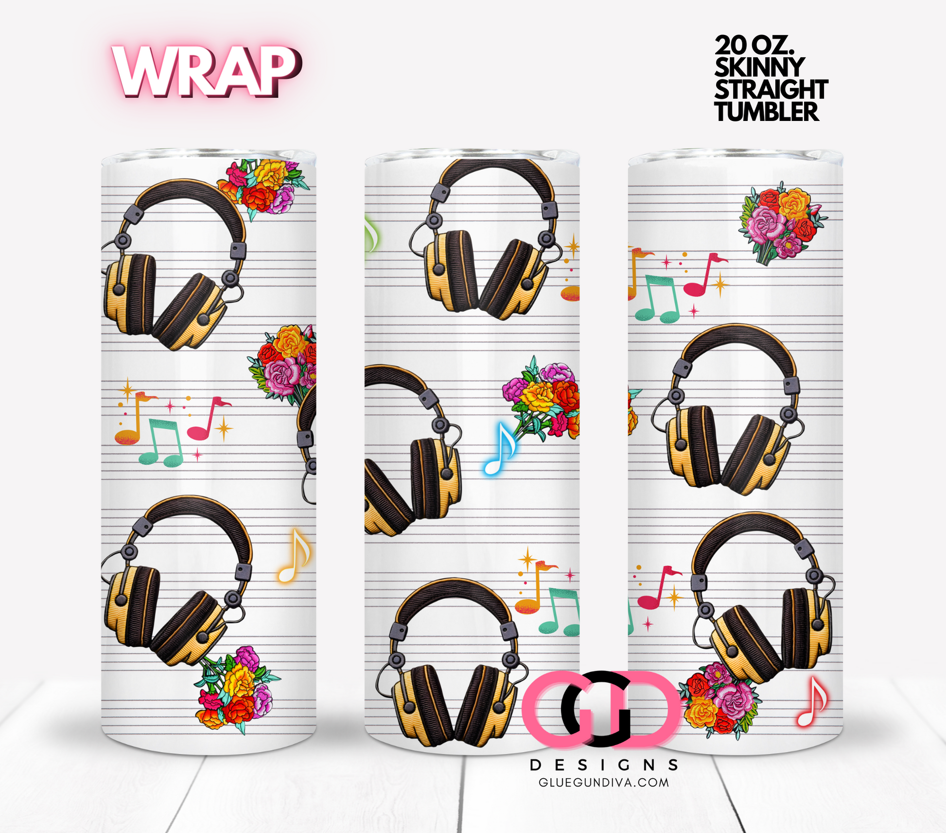 Headphones and Flowers - Digital tumbler wrap for 20 oz skinny straight tumbler